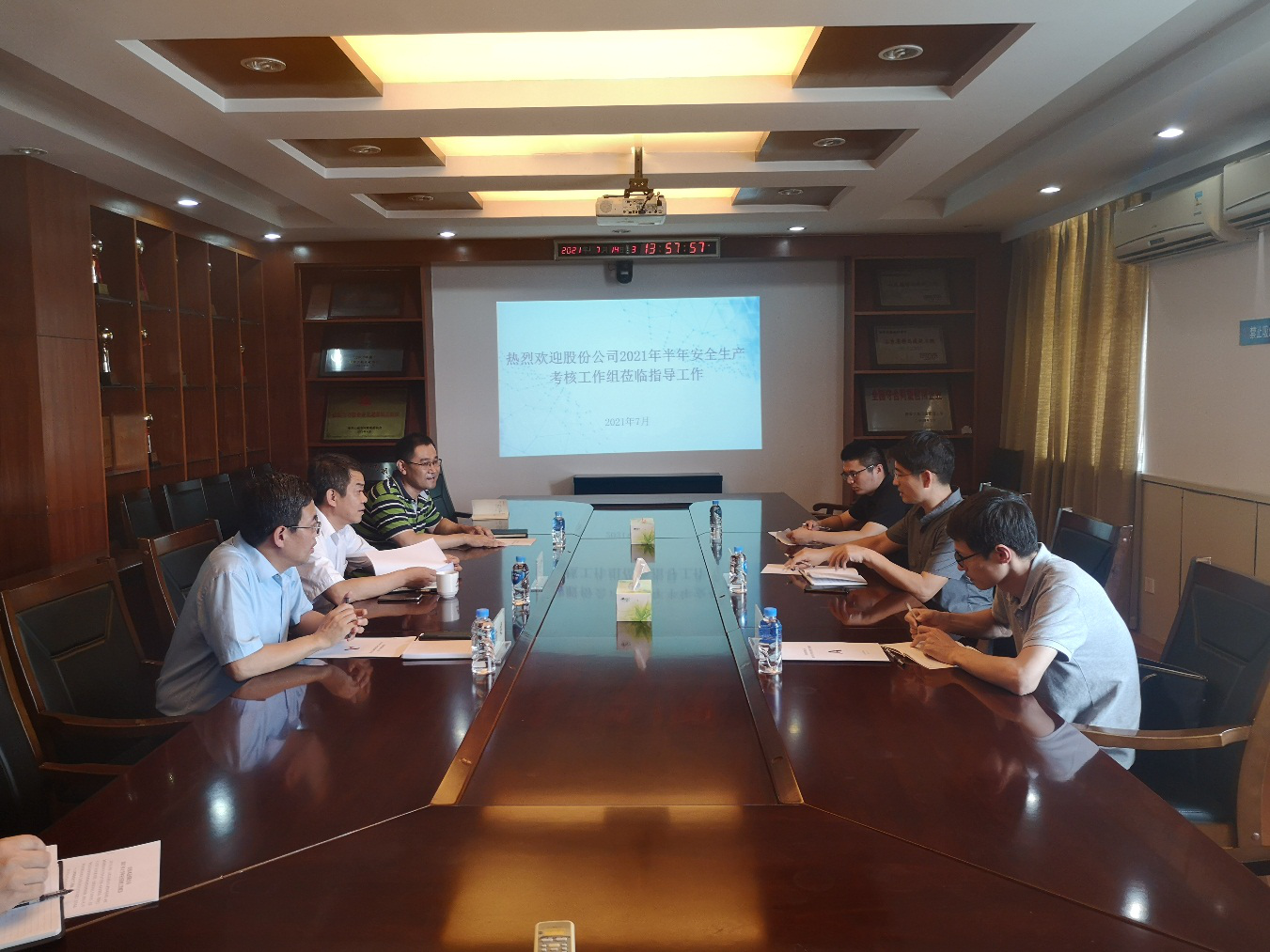 7月14日下午,高速路桥股份公司安全质量环保监督部部长李飞等一行3人来公司开展半年安全生产考核工作,公司党委副书记、总经理李光市、安全总监郭法文、安全管理部部长向建等参加了考核会议。