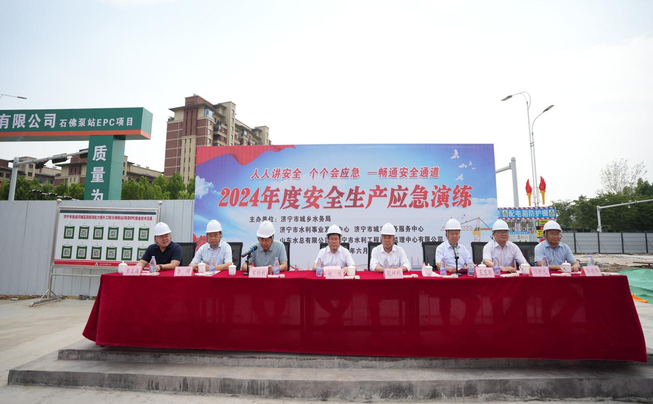 6月7日下午,济宁市石佛泵站项目部联合济宁市城乡水务局、济宁市城市水务服务中心、济宁市水利事业发展中心等单位开展安全生产应急演练,公司党委书记、董事长裴文晶、安全总监郭法文受邀出席本次演练活动,演练共设置触电事故、高处坠落、火灾、防洪度汛4个科目。