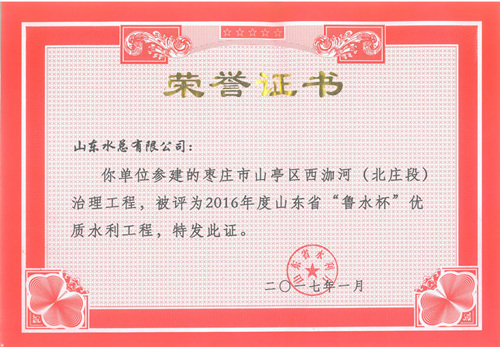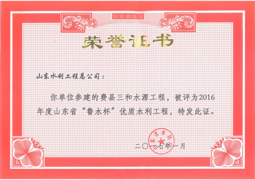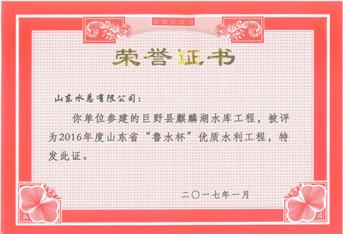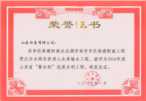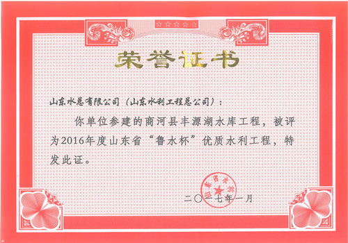 公司“招远市勾山水库除险加固工程”等八项工程被评为2016年度山东省“鲁水杯”优质水利工程